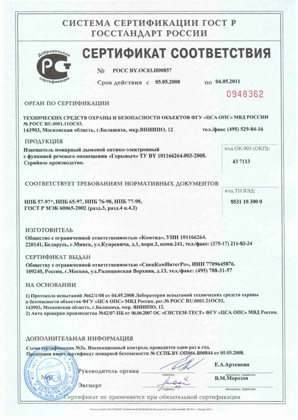 Сертификат соответствия ИП-"Горыныч" действителен до мая 2011 года